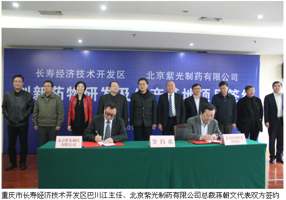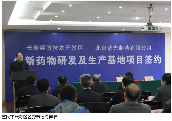 2015年12月14日,北京紫光制藥有限公司和長壽經(jīng)濟(jì)技術(shù)開發(fā)區(qū)關(guān)于創(chuàng)新藥物研發(fā)及生產(chǎn)基地項目的簽約儀式在長壽經(jīng)開區(qū)隆重舉行。